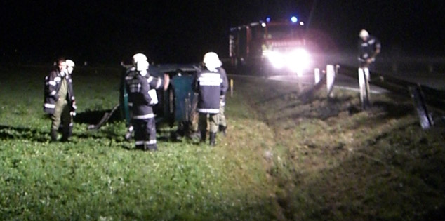 Dort angekommen wurde zuerst die Unfallstelle abgesichert und ausgeleuchtet sowie ein Brandschutz hergestellt. Das verunglückte Fahrzeug war hinter der völlig zerstörten Leitplanke auf der Seite zum Liegen gekommen. Die beiden Insassinen waren bei Ankunft der Feuerwehr bereits aus dem PKW befreit und wurden vom Roten Kreuz versorgt. Sie kamen mit leichten Verletzungen davon. Nach dem Eintreffen der nachalarmierten Feuerwehr Groß St. Florian übernahm diese die Einsatzleitung. Der PKW wurde nach dem auf die Räder stellen mit Hilfe des RF-C Groß St. Florian aus der Wiese gezogen und gesichert abgestellt. Mittels Ölbindemittel wurden die zahlreich ausgeflossenen Betriebsmittel gebunden und fachgerecht entsorgt. Zur Sicherung der zerstörten Leitschiene wurde die Straßenmeisterei nachalarmiert.