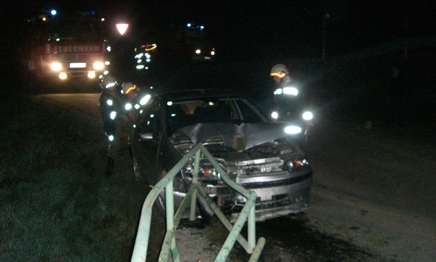 Nächtliche Fahrzeugbergung für die Feuerwehr Gussendorf. Ein PKW krachte gegen ein Brückengeländer.